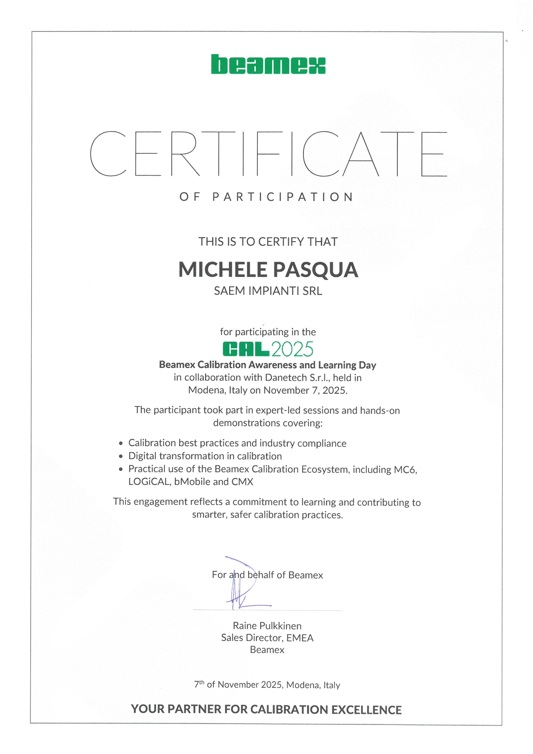 Certificato di Partecipazione del Dott. Michele Pasqua all’evento “Cal Day – Calibration Awareness & Learning Day” a Maranello